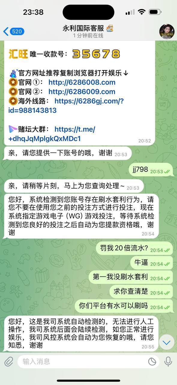联系客服后被告知:账户因“彩票刷水套利违规”而被冻结。荒唐的是——我从注册到现在根本没玩过任何彩票只玩百家乐和电子游戏。对话过程中,客服甚至撤回聊天记录,明显心虚。
